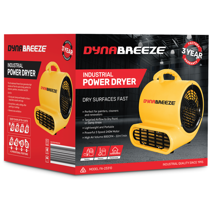 Dry surfaces fast with the Dynabreeze Industrial Power Dryer. This fan generates high volume air flow for quick drying and general air ventilation. Perfect for cleaners, painters, renovation and D.I.Y jobs