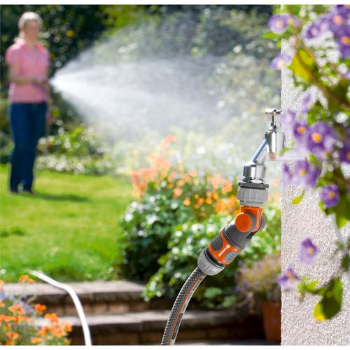 The GARDENA Angled Swivel Tap Connector prevents kinking and twisting of the hose at the tap thanks to the rotating and swivelling connector. A quick and easy tool-free hose tap connector for 13mm garden hoses.