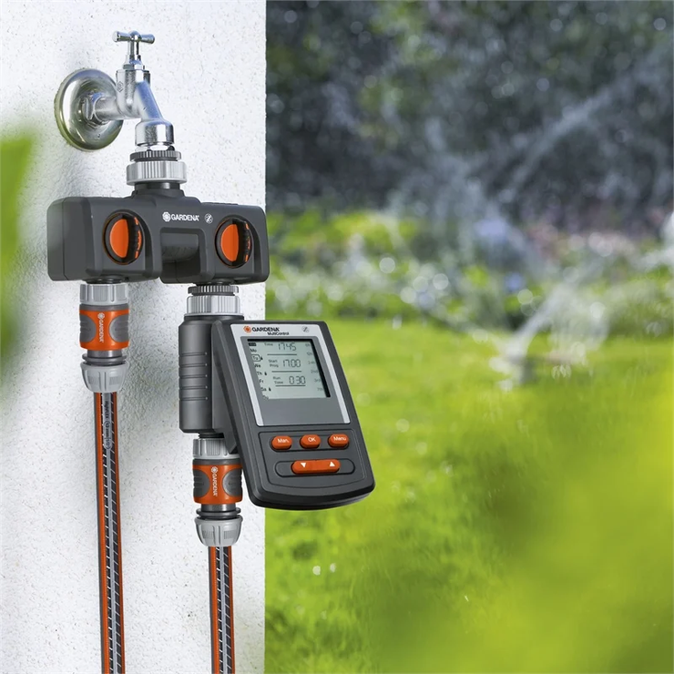 Only one water source, but want to connect two GARDENA watering devices at the same time? The GARDENA Twin Tap Connector makes it possible to simultaneously connect two hoses to the same tap. It suits 1" and 3/4" taps and 13mm hose connectors. Flow rates can be adjusted and/or shut off and each outlet can be set independently.