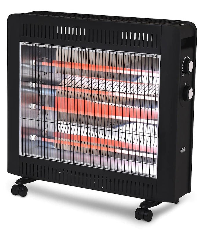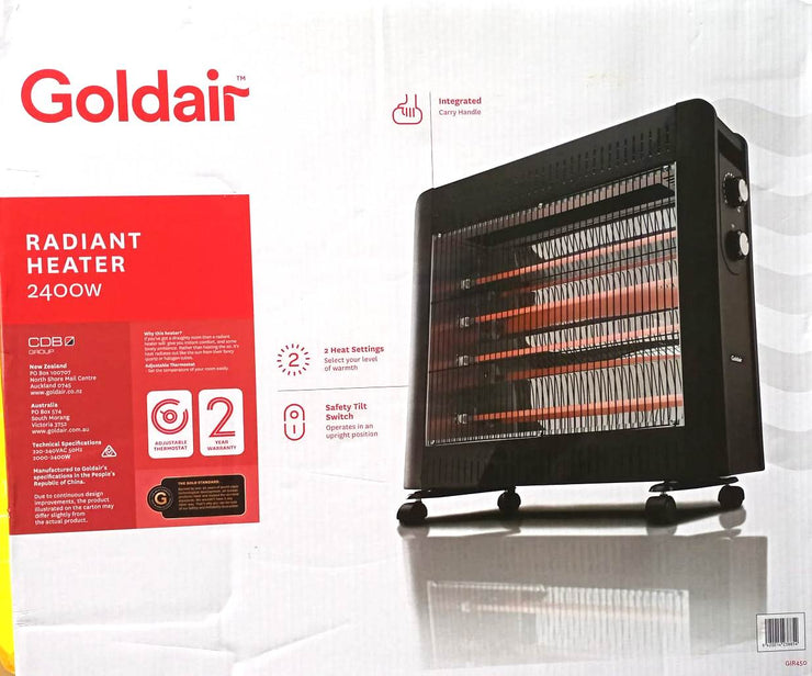 This Goldair 2400W 4 Bar Radiant Heater will give you instant comfort and some lovely ambiance. Choose your preferred temperature with 2 heat settings and an adjustable thermostat. Its integrated carry handles and castors provide extra flexibility around movement and features a safety tilt switch for added safety