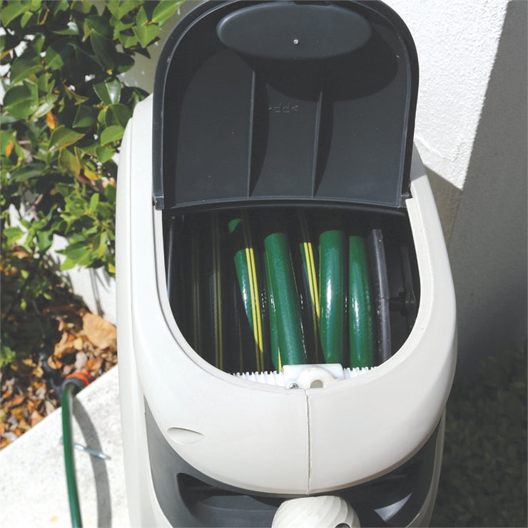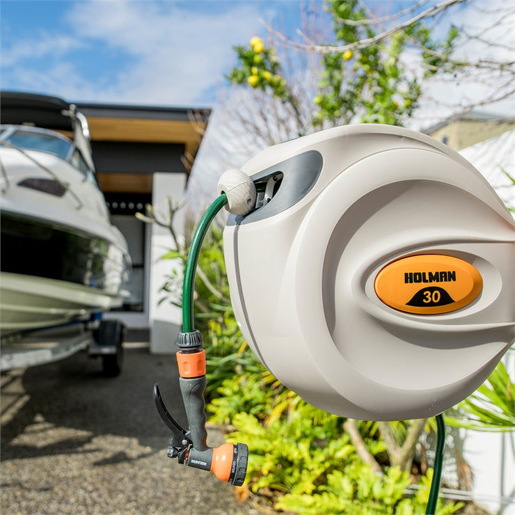 Create a neat hose storage solution in a large backyard or a small apartment balcony with a Holman Retractable Hose Reel.