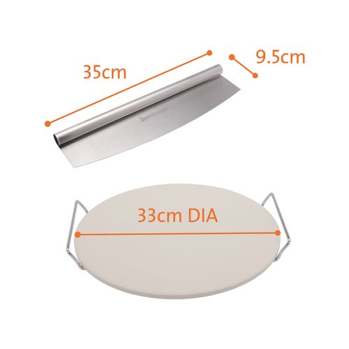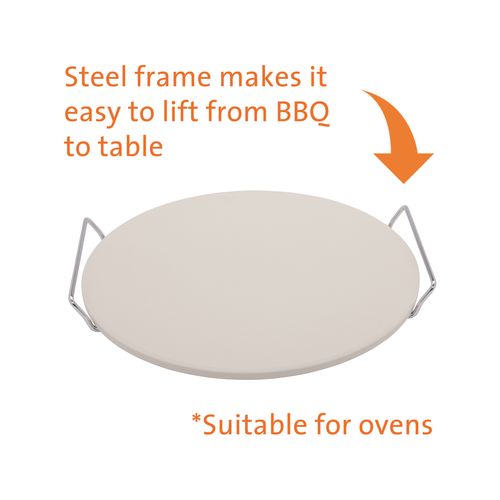 Achieve the perfect pizza crust with the Jumbuck BBQ Pizza Set. Features a 33cm ceramic baking stone for crisp pizza bases. Also includes a wire frame for easy handling and a stainless steel pizza wheel. Great for cooking gourmet pizzas at home in the BBQ or oven.