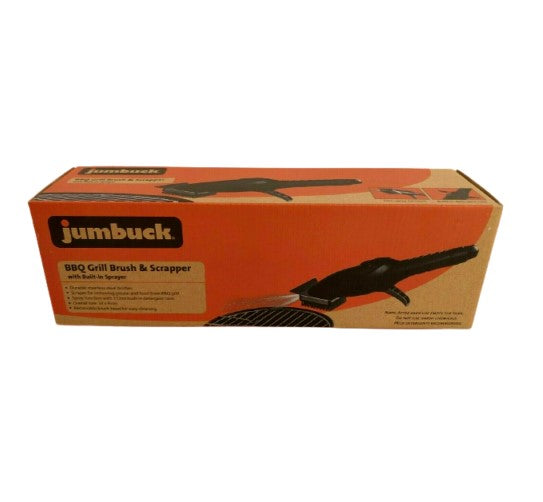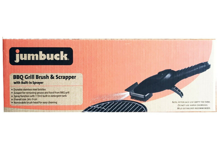 Jumbuck BBQ Grill Brush & Scrapper with Sprayer and detergent tank features durable stainless steel bristles, a removable brush head for easy cleaning, a built-in sprayer and a scraper for removing grease and food from your BBQ Grill.