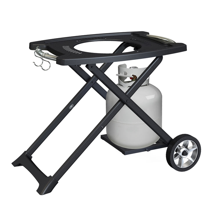 The Jumbuck Portable Gas BBQ Trolley has been specifically designed to suit the Jumbuck Portable Gas BBQs. This trolley features a folding design for easy storage, comes with a mounting base to hold a gas cylinder, and large wheels for portability.
