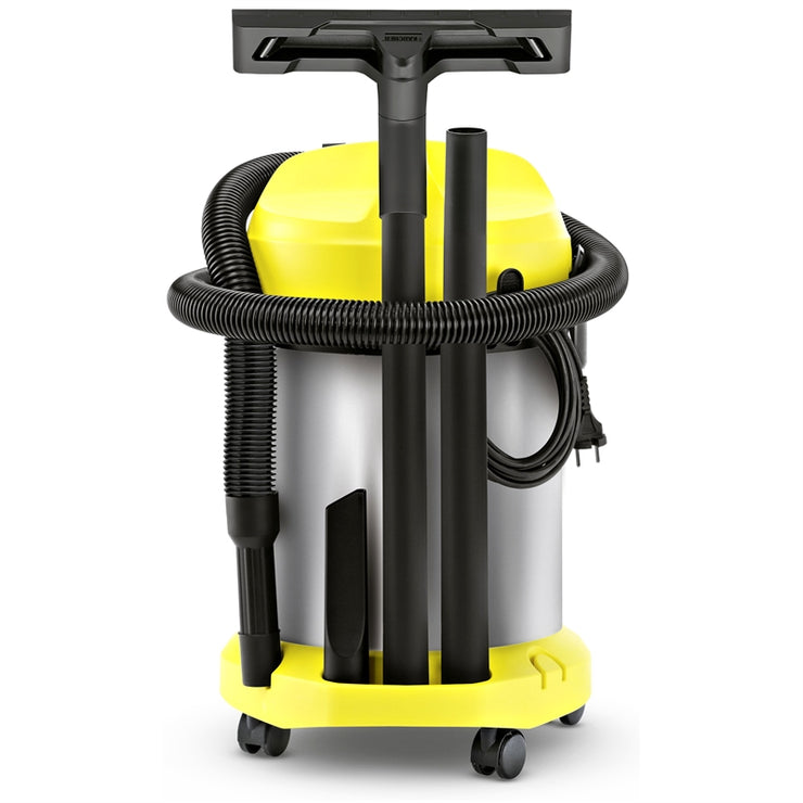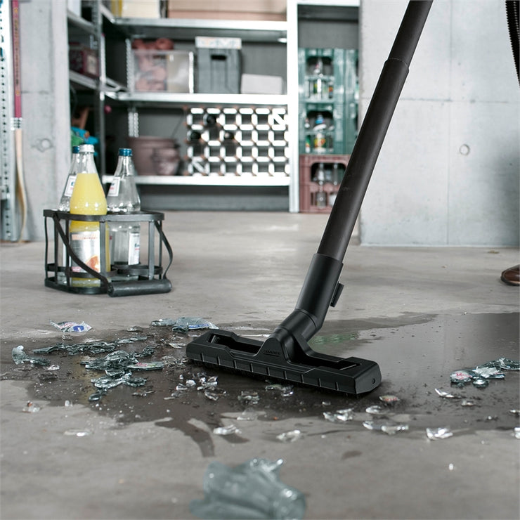 The compact WD 2 Premium multi-purpose vacuum cleaner: Powerful vacuuming with a power consumption of just 1,000 watts. The practical entry-level device is equipped with a robust and corrosion-resistant 20-litre stainless steel container and a foam filter. Thanks to the newly developed clips floor nozzle with mixed insert, dirt of all types can be reliably removed. The practical parking position allows comfortable intermediate parking of suction tube and floor nozzle during working interruptions. The ergonomic carrying handle, the "Pull & Push" locking system and the practical cable and accessory storage complete the equipment package of the WD 2 Premium multi-purpose vacuum cleaner.