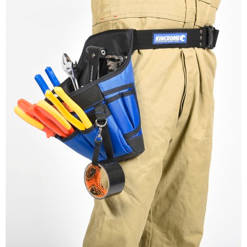 The Kincrome electricians tool belt synthetic pouch features a hook and loop fastener, small carabiner, tool loops for large tools, tape measure holster, 13 universal pockets and with a large 50mm belt loop, provides a universal fit.
