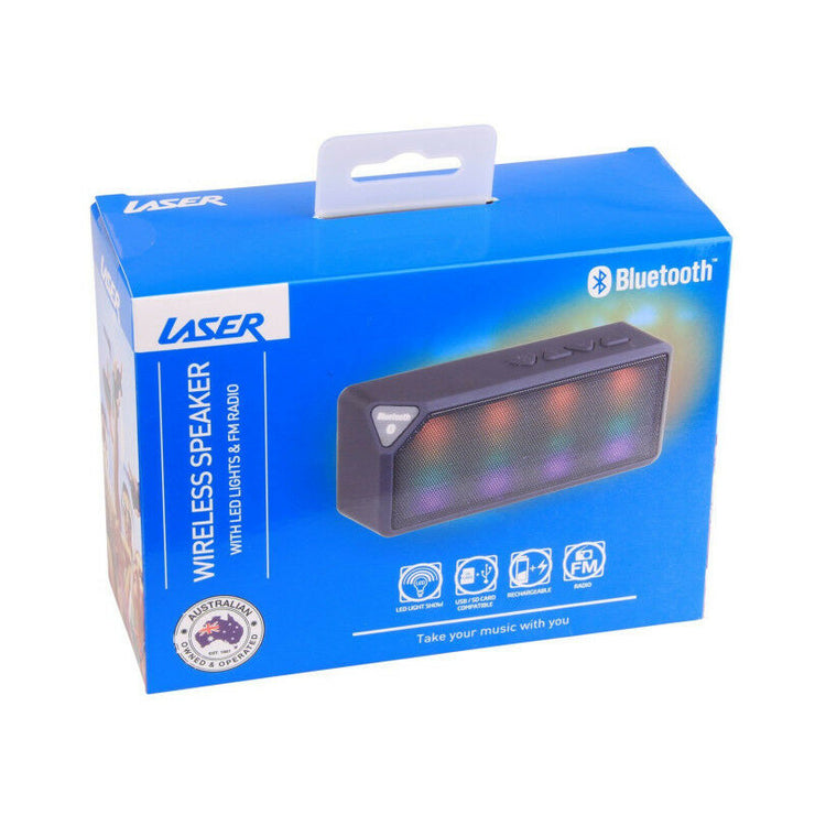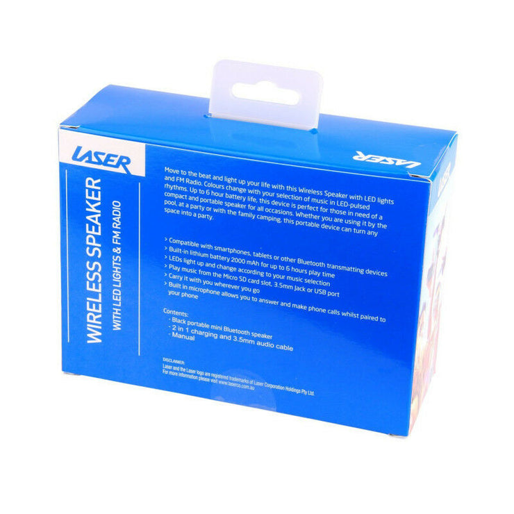Move to the beat and light up your life with this Wireless Speaker with LED Lights and FM radio. Colour's change with your selection of music in LED-pulsed rhythms. Splash-proof with up to 6 hour battery life, this device is perfect for those in need of a compact and portable speaker for all occasions. Whether you are using it by the pool, at a party or with the family camping, this portable device can turn any space into a party.