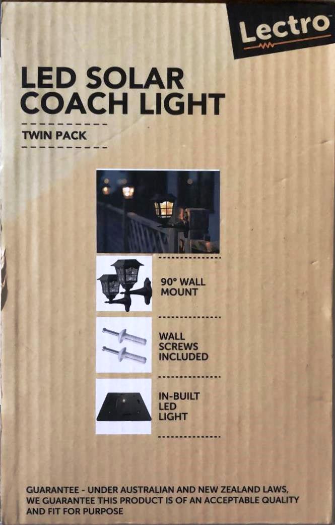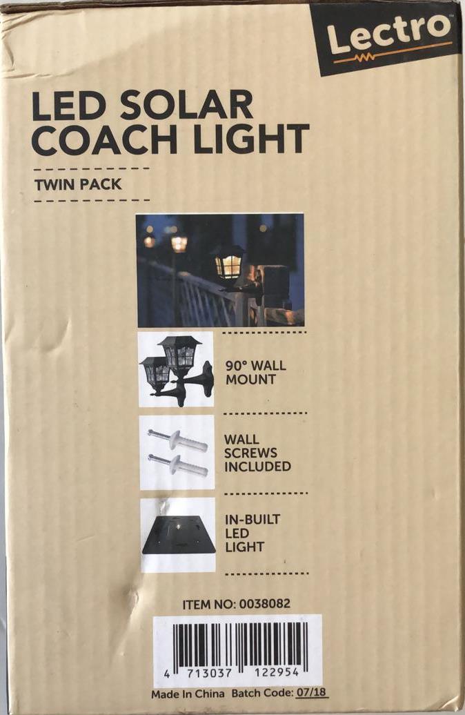 Lectro LED Solar Coach Light Twin pack is deal for outdoor walls and garden area. With Up to 8 hours operating time this Coach Light is waterproof and automatically illuminates at night-time.