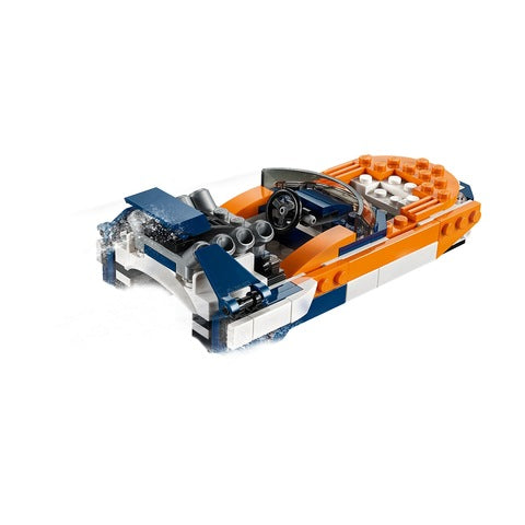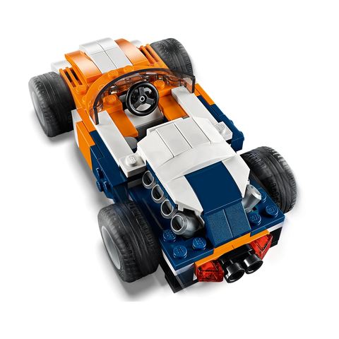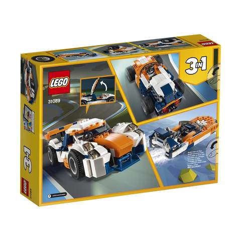 Kids can zoom around the race circuit with the Sunset Track racer, featuring a fresh bright orange, white and dark blue colour scheme, aerodynamic bodywork with large air intakes, rounded and tinted windshield, tinted headlamps, visible rear-mounted engine, large rear spoiler and ground-gripping tyres. They can also check out the low-friction, cross-axle design and lift the roof to access the cockpit. Then take their place at the start line and get ready to race! When they're done, rebuild this LEGO Creator 3-in-1 model to create an open-top Classic Race Car or take to the waves aboard a powerful Speed Boat.
