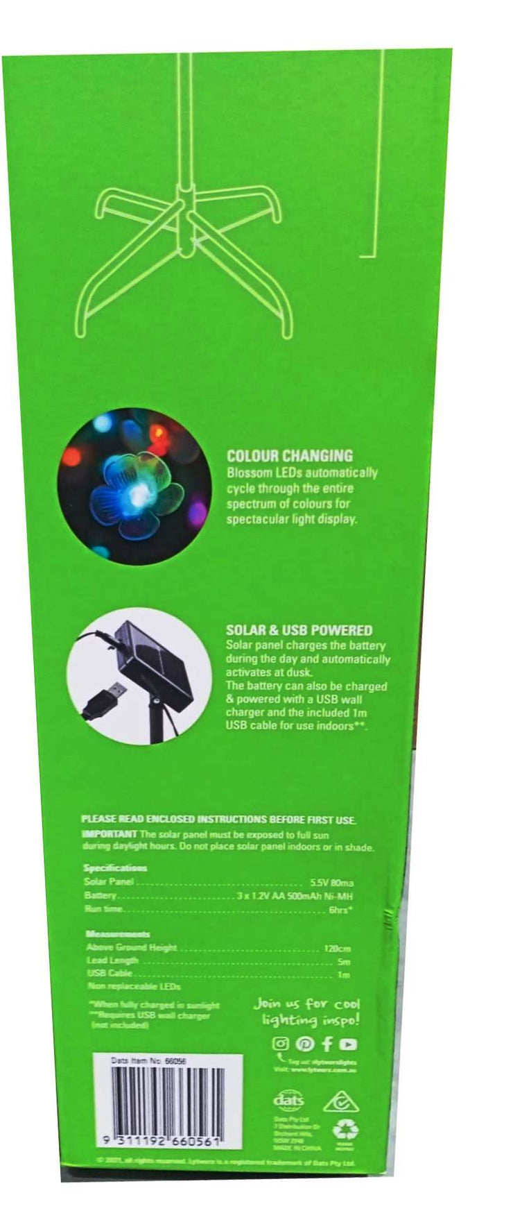 The COLOUR CHANGING Blossom LEDs automatically cycle through the entire spectrum of colors for a spectacular light display. The Solar panel charges the battery during the day and automatically activates at dusk. The battery can also be charged & powered with a USB wall charger and the included 1m USB cable for use indoors.