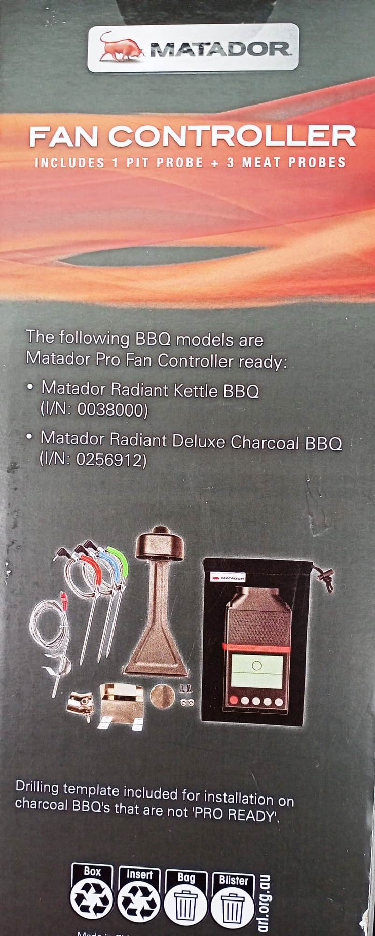 The Matador Fan Controller has been designed to help you maintain a pre-programmed cooking temperature on your charcoal BBQ. Through interpreting the readings from the included Pit Temperature Probe, the Fan Controller determines when to activate its fan and direct airflow into the BBQ. Through the smart application of oxygen to the fuel source, the Matador Fan Controller takes the guesswork out of when to open the bottom air vent and deliver the perfect cook.