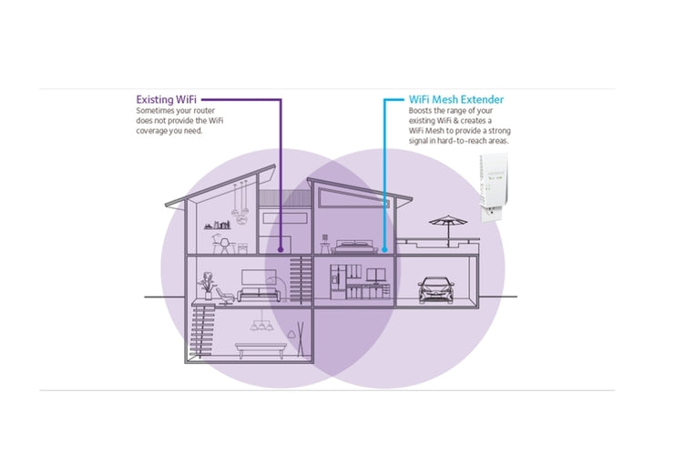 The AC1750 WiFi mesh extender lets you create whole-home WiFi mesh with your existing router. It features smart roaming and one WiFi name for seamless WiFi connection throughout your network. It supports 802.11ac, ax and a/b/g/n WiFi devices and works with your existing WiFi router. Nighthawk® App allows for quick setup and easy extender management.