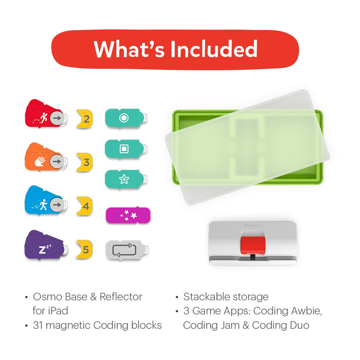 - Comes with Osmo base for iPad, 19 magnetic coding blocks, Coding Awbie, Coding Jam, Coding Duo apps, and stackable storage.