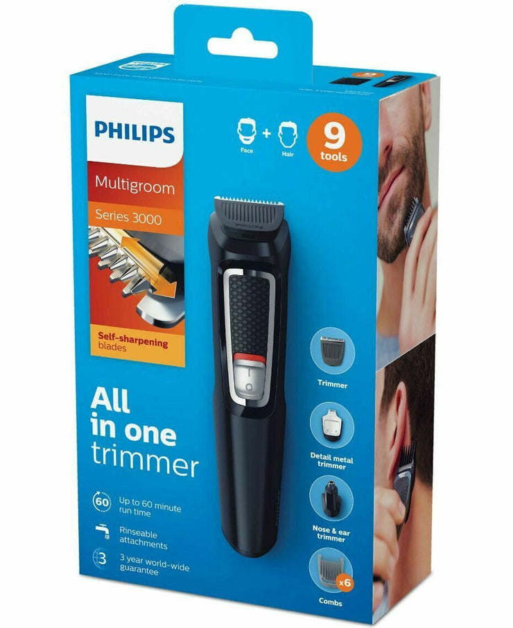 9-in-1 trimmer featuring self-sharpening steel blades. Up to 60 minutes run time and rinseable attachments. Styling tools include: