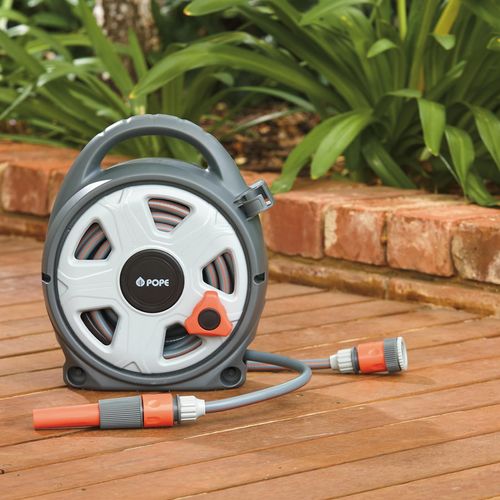 Lightweight and portable, the Pope Small Garden Hose Reel is handy to carry around while watering and can be mounted on the wall for easy storage.