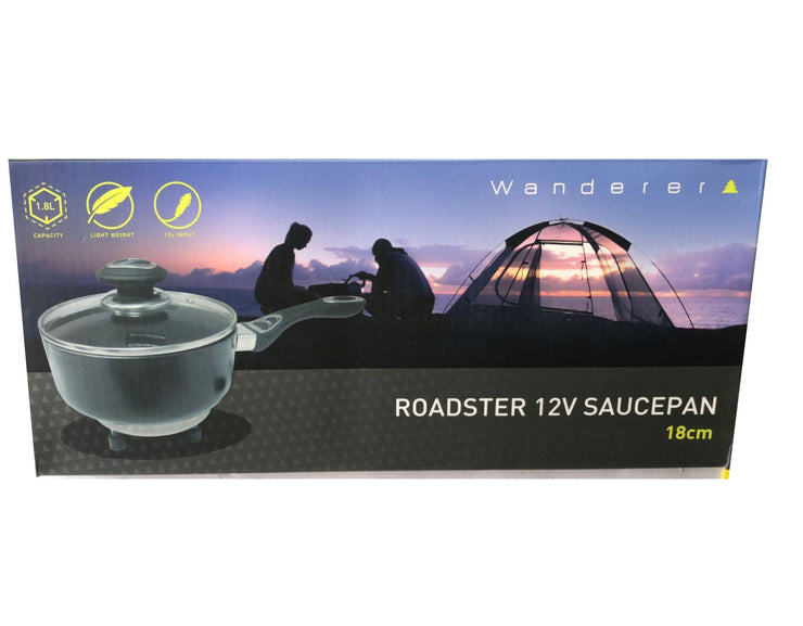 The Wanderer 18cm/1.8L Roadster12v Portable Saucepan is ideal for Caravanning  Camping Or Boating with a non-stick coated cooking surface, vented tempered glass lid, cool handle, and non-slip feet. When you need a home-cooked meal on the road this Wanderer Roadster 12v Saucepan is just the ticket!