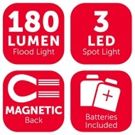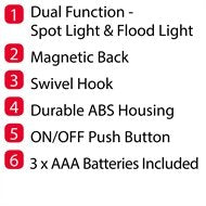 This powerful, compact 2-in-1 utility torch features a 3 watt, 180 lumen flood light and a 3 LED spotlight can be used for auto, home, camping and workshop.