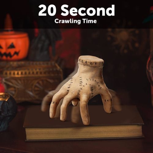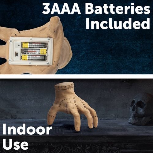 Arlec Animated Zombie hand with 20 seconds of crawling time initiated by touch. It operates on 3 AAA batteries (included with the product).