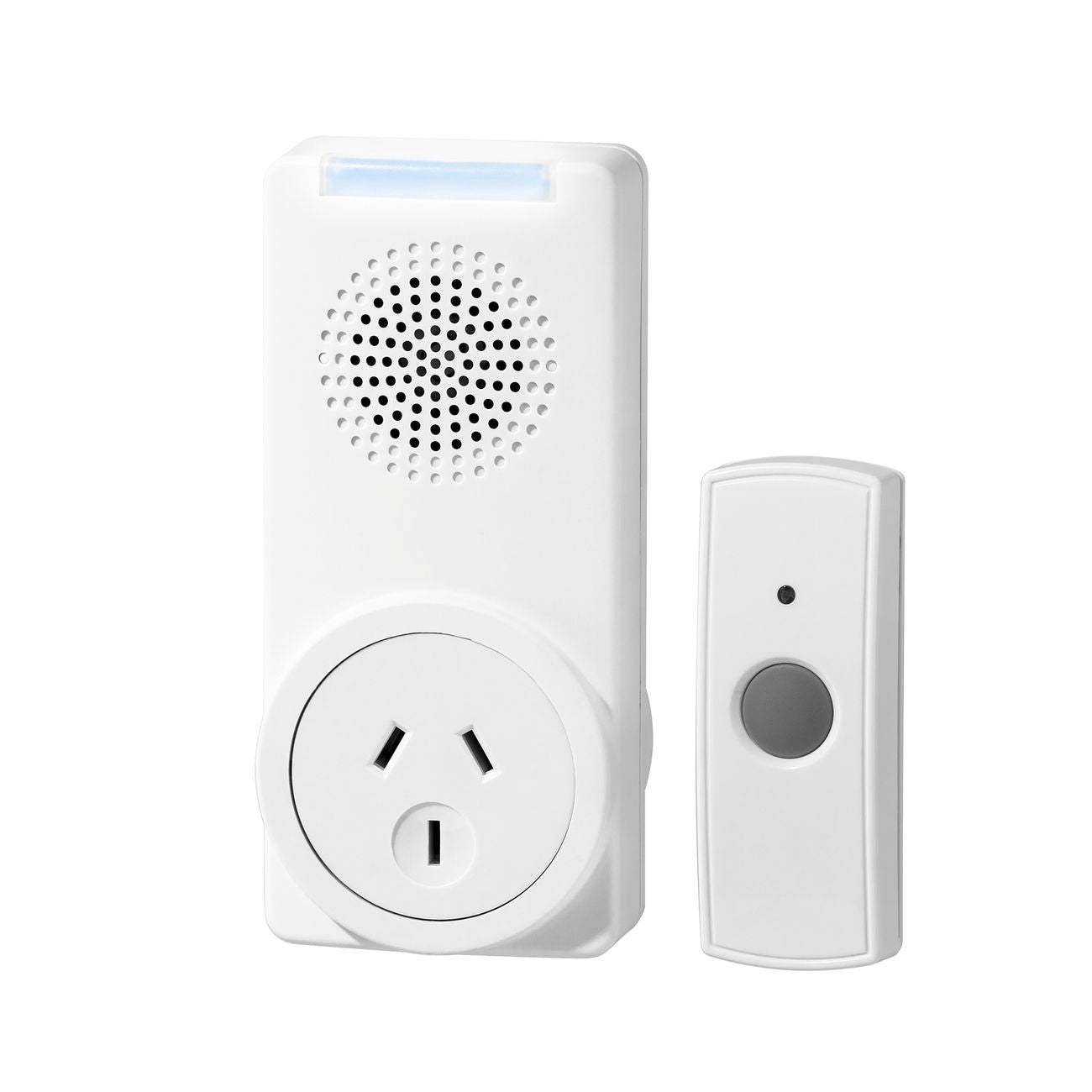 This Plug in Wireless Door Chime from Arlec features an operating range of up to 150 metres, Flashing Blue LED Visual Chime Alert, 8 selectable chime tones, built-in power socket and IP55 rated weatherproof transmitter.