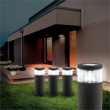 The Arlec Sandor Bollard Light features a unique sandstone body in a grey render finish. This solar light charges during the day and automatically turns on at dusk with its super bright 10-lumen white LED.