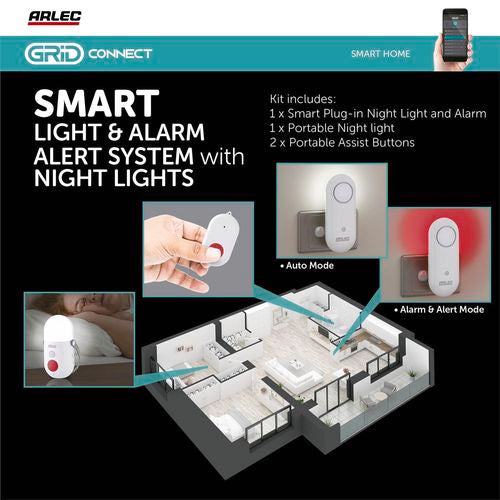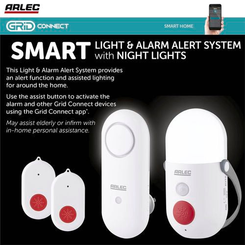 The Light & Alarm Alert System provides an alert function and assisted lighting around the home. Use the included portable assist button to activate the alarm and other Grid Connect devices using the Grid connect app.