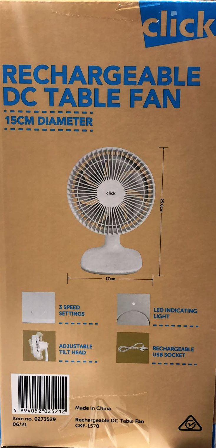 Click 15cm Rechargeable Desk Fan features 3 speed settings, adjustable tilt head and USB Socket. This portable slimline design fan will keep you cool at your desk or table.