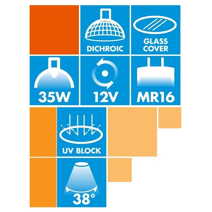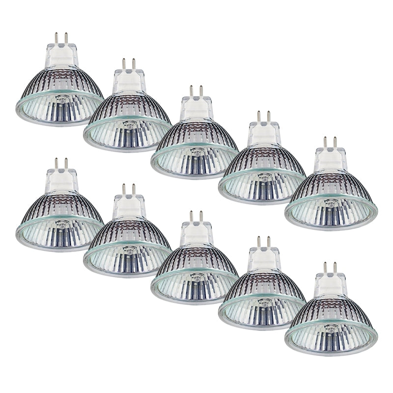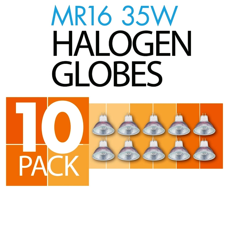 This Arlec 10 pack of 35W MR16 halogen globes are most commonly suited to downlights. 12V 35W Warm White iridescent Lamp uses 30% less energy, has a longer life and higher light output than standard halogen lamps.