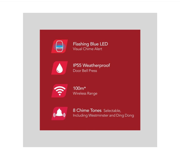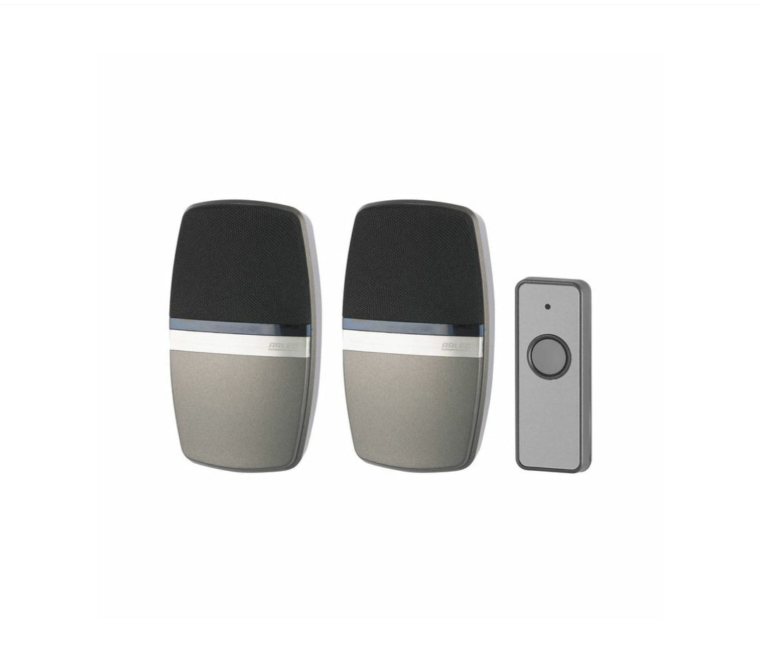 The Arlec Premium Sound Output Wireless Door Chime Twin Pack features a 100 meters operating range, IP55 weatherproof bell press, extra flashing blue LED and 8 selectable chime tones. It is easy to install, no wiring is required.