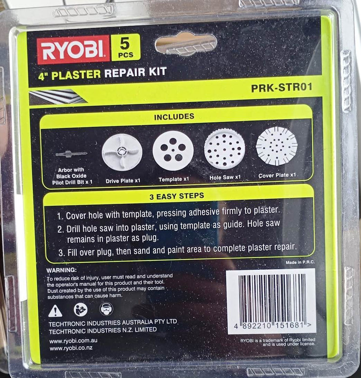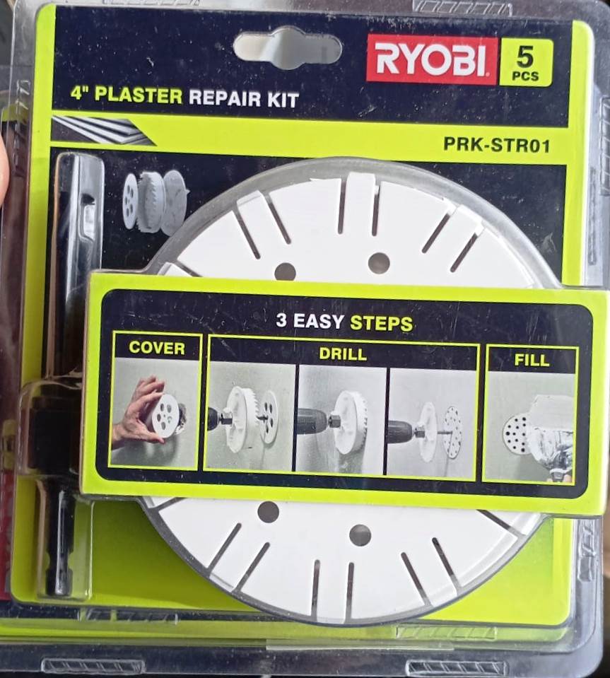 This Ryobi Plaster Repair Starter Kit is a new, innovative way to repair drywall easily without calling a professional or investing in an abundance of supplies. Get the job done in less than half the time of a traditional repair with Ryobit's three-step process. Wall repair with Ryobi Plaster Repair Starter Kit is completed in 3 easy steps Cover, Drill, and Fill without any abundance of supplies.