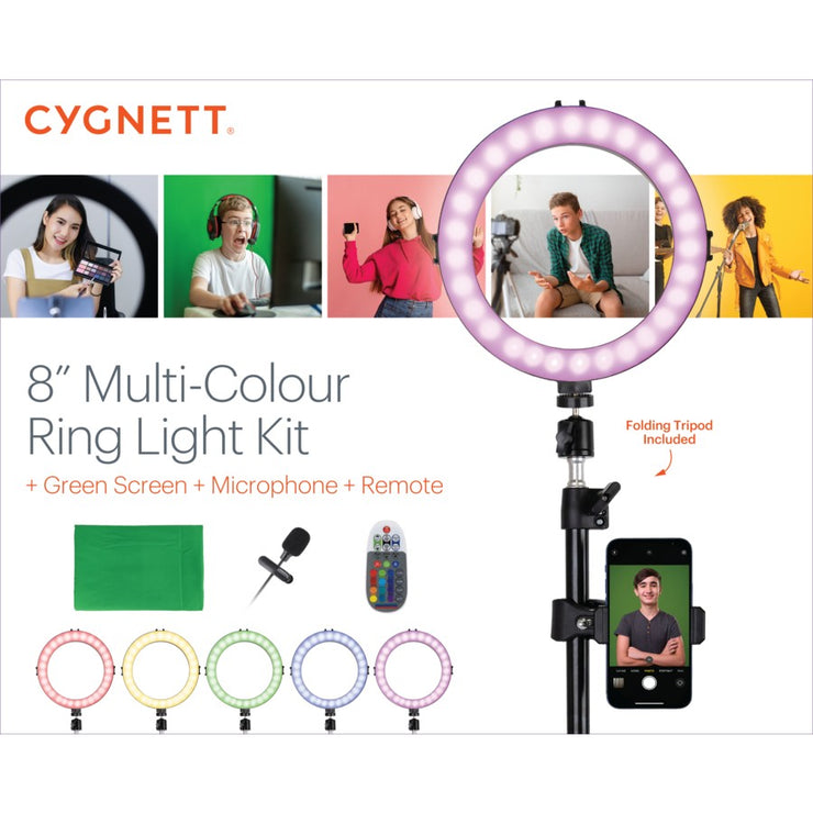 This kit comes with everything you need to start creating, including a green screen, microphone and colour changing 8” ring light.