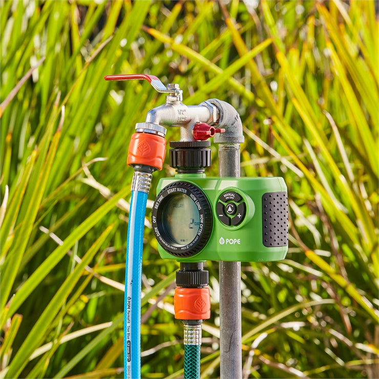 The Pope Snapshot Tap Timer attaches to your garden tap on one end and garden hose/irrigation system at the other. The timer is very easy to operate with just six steps needed to program the timer. With a large, easy to read display and super simple user interface you can sit back and relax. The Snapshot uses A4 batteries with an on screen battery life indicator.