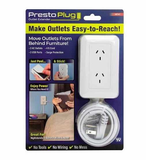 When you have to plug in and charge up, does reaching for a hidden outlet make you stretch and strain? Then you need Presto Plug! The new power outlet relocator that makes plugging in and charging up easier than it’s ever been! Presto Plug lifts cords off the floor and allows furniture to go flush against the wall, making it great for the office, workshop or anywhere you need power.