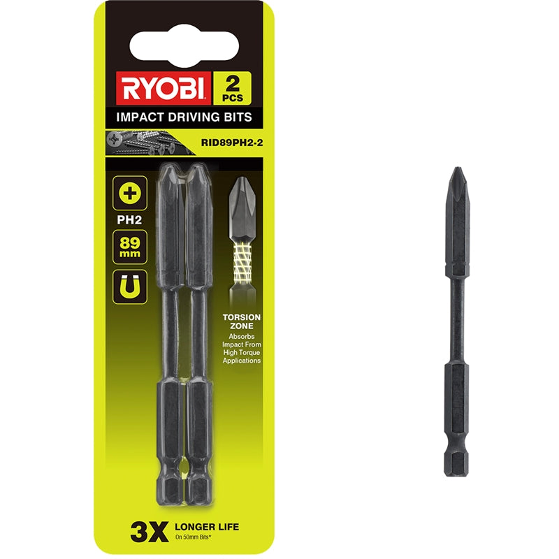 Fasten screws with absolute power and precision with the RYOBI Ryobi 89mm PH2 Impact Driving Bits - 2 Pack. These bits feature a hardened shank and clever torsion zone. Combined, these features provide incredibly strong drilling that can flex under high-torque applications. The engineering also ensures a 3x longer life compared to standard bits. For an ultimate hold, the precision milled tip is magnetised to find the perfect fitment every time. This reduces cam outs and helps you move from screw to screw much faster. With the 2 bits included, you can stock up your RYOBI Modular case set with the bits you need to complete your jobs easier.