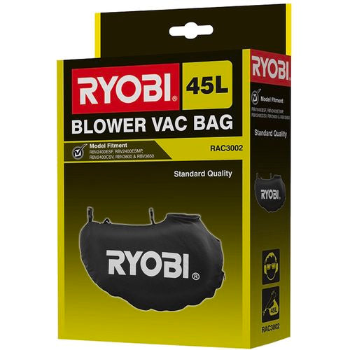 The Ryobi RAC3002 Standard Quality Blower Vac bag is a direct replacement for the original bag included in the Ryobi Blower Vac models RBV2400ESF, RBV2400ESMP, RBV3600 & RBV3650.