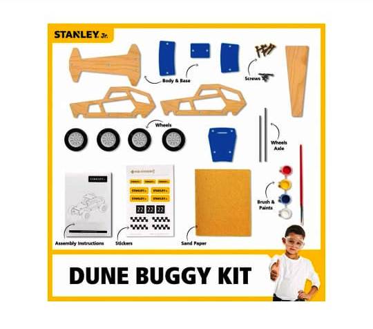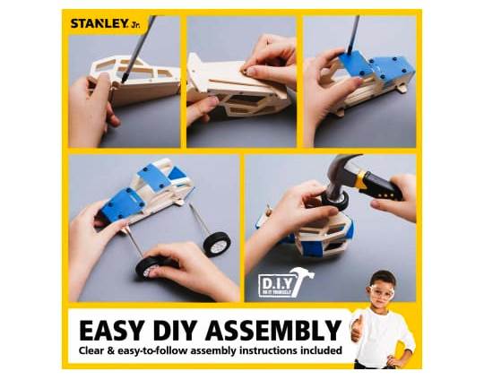For generations, STANLEY R tools have been A part of growing up. Our line of high quality  STANLEY R Jr. Product offer wholesome inspiration , Learning And fun for everyone . Kit includes pre -cut wood pieces, decals, plastic  pieces , and all screws  & nails required to assemble model . Build and customize your own working Race car with the included paints and decals. A great project for parents and Kids to work on together